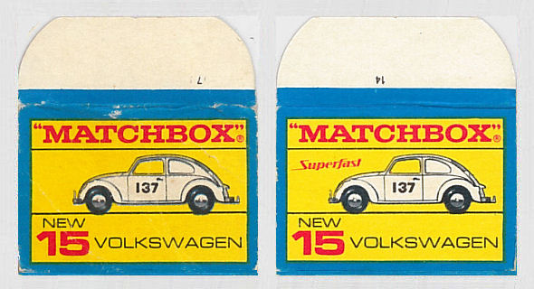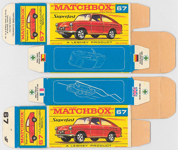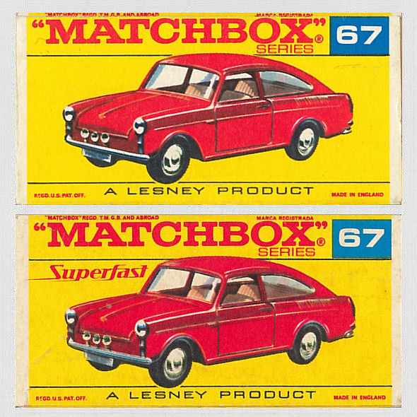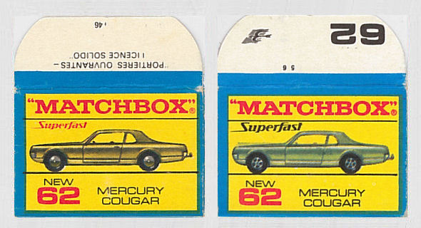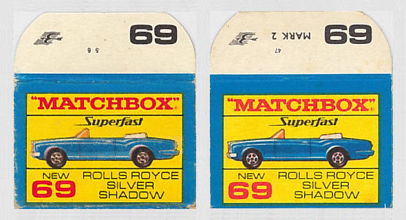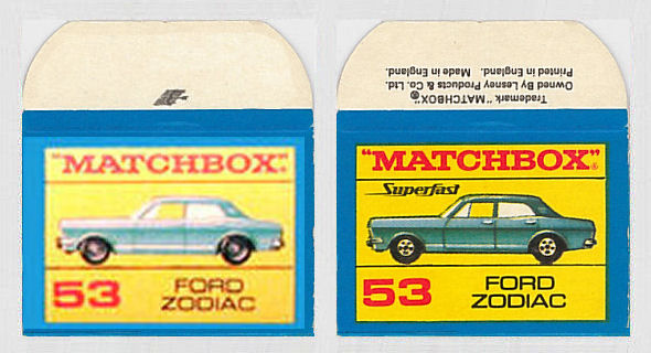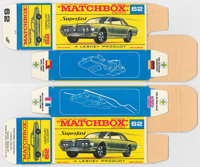 F type boxes were used for Matchbox Series 1-75 models in 1969 and 1970, which included both Regular wheel and Superfast models. This page is devoted to the Superfast boxes only but also shows comparisons between boxes made for Regular wheel and Superfast versions of the same models.
